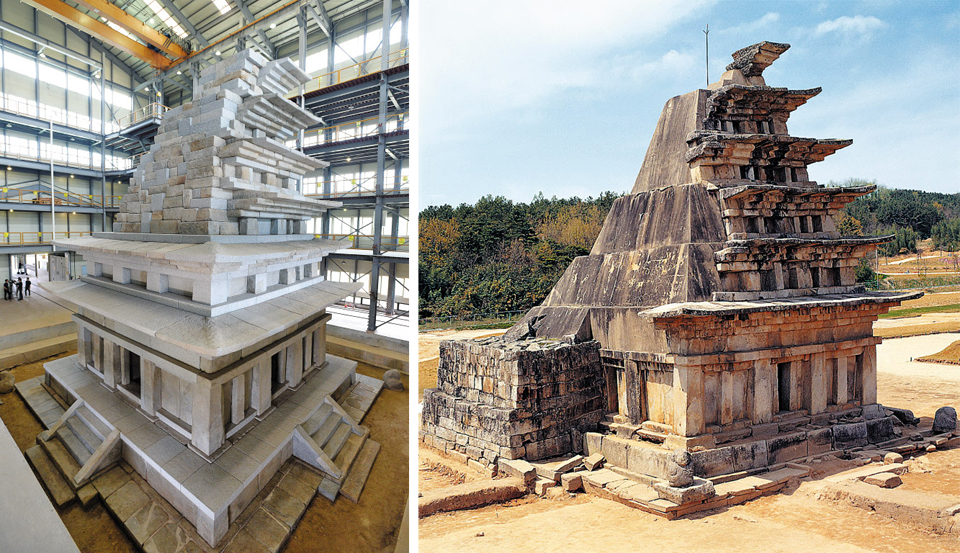 세척, 구조 보강, 색 맞춤 등의 작업을 거쳐 마침내 복원된 미륵사지석탑의 높이는 14.5m, 폭 12.5m, 무게는 1830t. 부재는 모두 1627개로, 경주 석가탑의 부재가 48개인 것과 비교하면 엄청난 규모다. 문화재청은 덧집을 철거한 뒤 12월부터 미륵사지석탑을 일반 공개할 예정이며, 건립 1380주년에 맞춰 내년 3월 12일 준공식을 연다.
