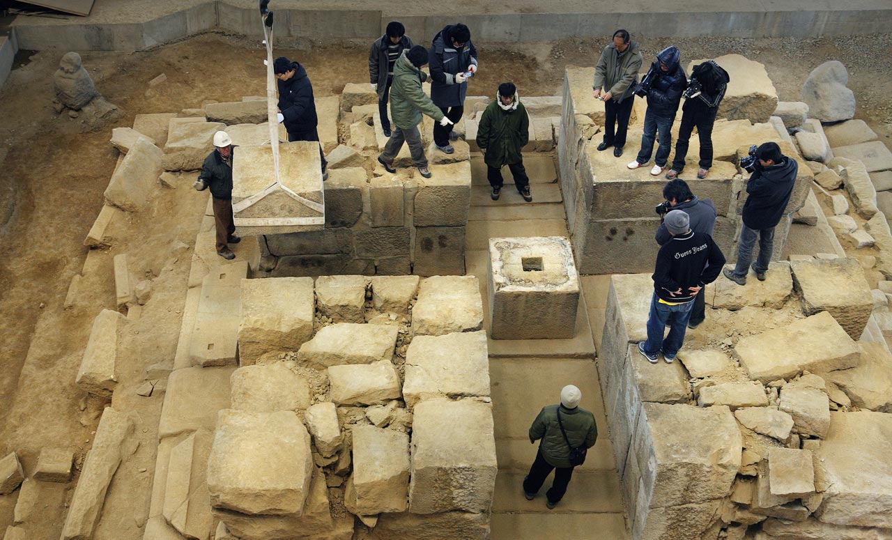익산 미륵사지석탑 해체 수리 중이던 2009년 1월 사리장엄구 유물이 나온 1층 심주석(가운데 기둥을 이루는 돌 구조물) 앞에서 문화재청 관계자들이 취재진에게 유물 출토 상황을 설명하고 있다. /문화재청